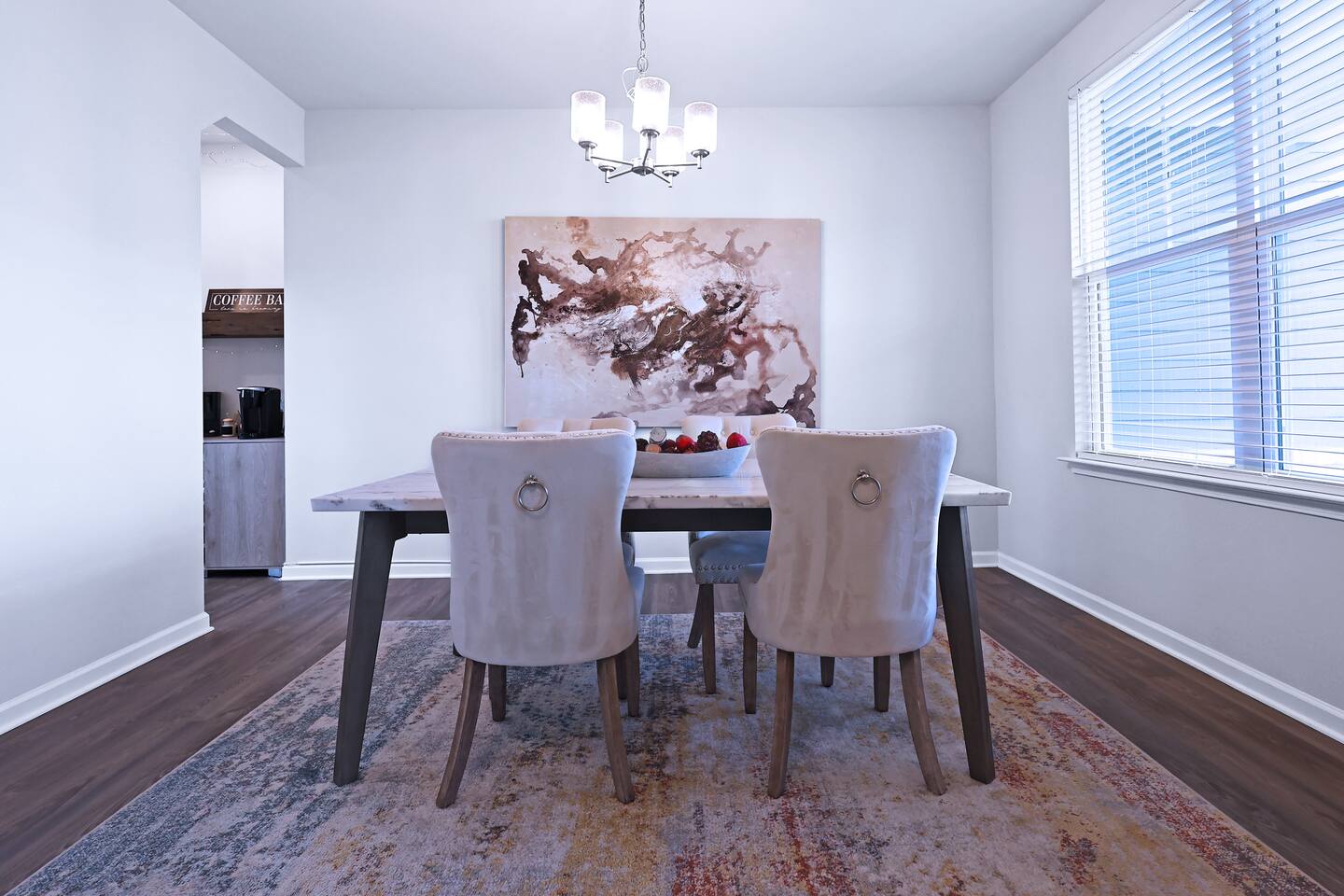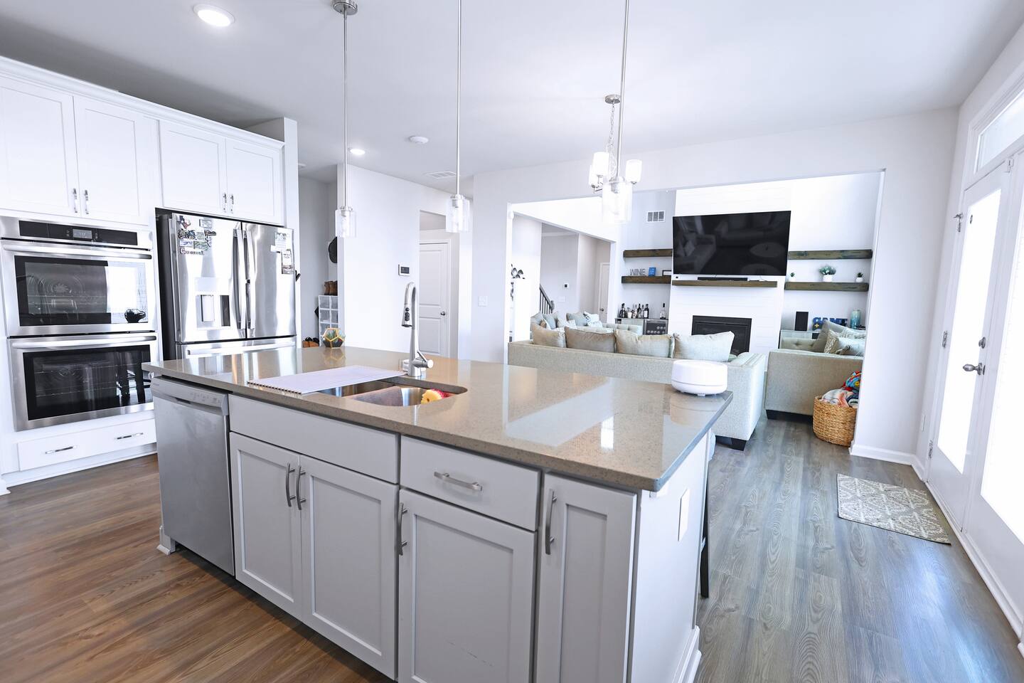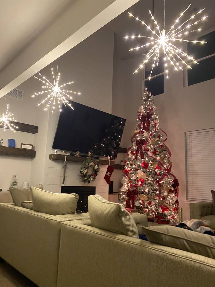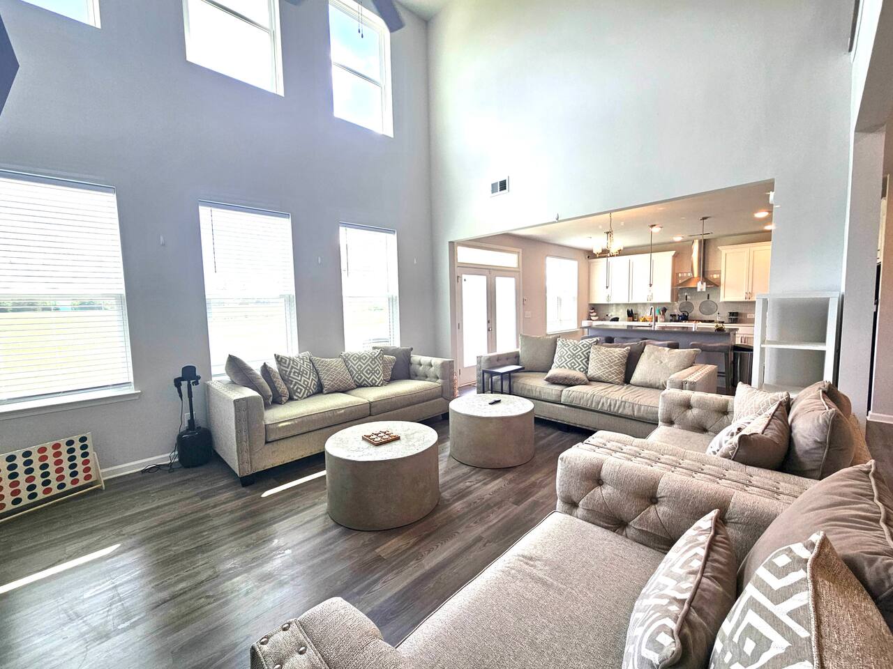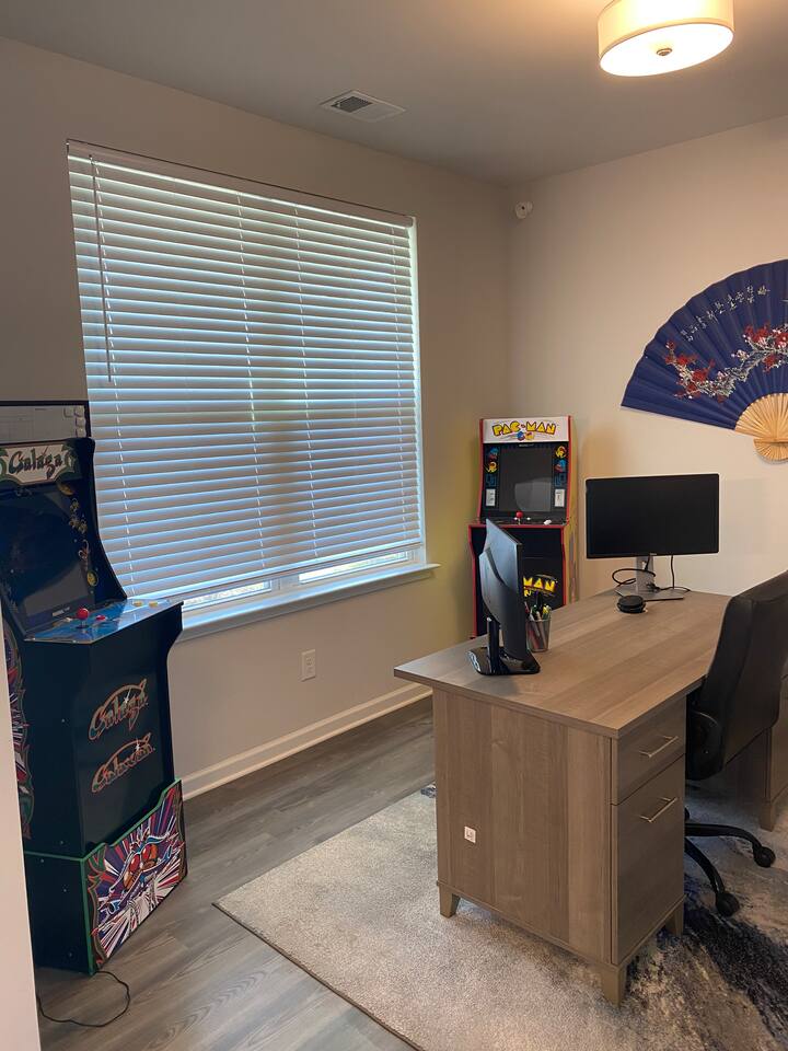3 Bedroom & 3.5 Bathroom Queen beds in all 3 bedrooms Modern full bathrooms with a shower/tub combo, stocked with fresh towels, toiletries, and a hairdryer for your convenience. Office/Game Room: Right as you walk through the door, you have access to the office space for remote work or if you're in the mood for a little gaming session, you have access to the arcade games as well. Living Space: An expansive living room with modern plush sofas, and an 85" smart TV above the fireplace, perfect for unwinding after a day of shopping, exploring, or working remotely. Bright windows fill the space with natural light, creating a warm and inviting atmosphere. Kitchen & Dining: A fully equipped kitchen with all the essentials: stove, double-oven, microwave, fridge, cookware, and dishes. A four-person formal dining room for morning coffee or casual dining. Laundry Room: Located on the second floor of the home, the laundry room is stocked with starter laundry detergent and dryer sheets if you need them. Outdoor Space: Step out to the private backyard, ideal for relaxing with a book, enjoying an evening glass of wine, or just soaking up the quiet neighborhood vibe. Parking: You are free to park in the driveway or garage. Guest Access You’ll have the entire home to yourself-including the backyard-ensuring complete privacy during your stay. Other Things to Note Check out the Guest Guidebook on the welcome table for important info! Perfect Location: 2 minutes to Publix 5-10 minutes to Tanger Outlets 10-15 minutes to I-75 for quick trips to Atlanta or Macon Close to local restaurants, coffee shops, and parks We look forward to hosting you! Please note, no parties, but if you want to host a respectful, small gathering please let me know in advance. With approval an event fee can be added.