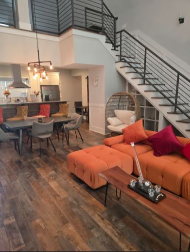 Inside the Home: Versatile, Comfortable & Spacious This 5-bedroom home is thoughtfully designed for flexibility and comfort, making it ideal for traveling professionals. Each bedroom is uniquely furnished with a variety of sleeping options including queen beds, futon couches, and daybeds offering restful accommodations to suit every need. The interior features a charming loft-style feel with an open-concept layout, combining spaciousness with a warm, country-cozy atmosphere.
